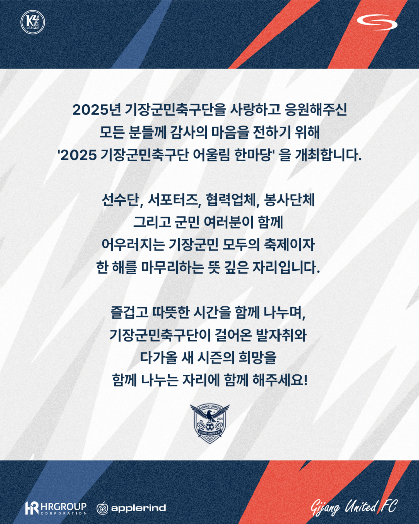 본 행사는 선수단, 서포터즈, 협력업체, 봉사단체, 그리고 군민 여러분이 함께 어우러지는 기장군민 모두의 축제이자, 2025년 시즌을 따뜻하게 마무리하는 뜻깊은 자리입니다.
