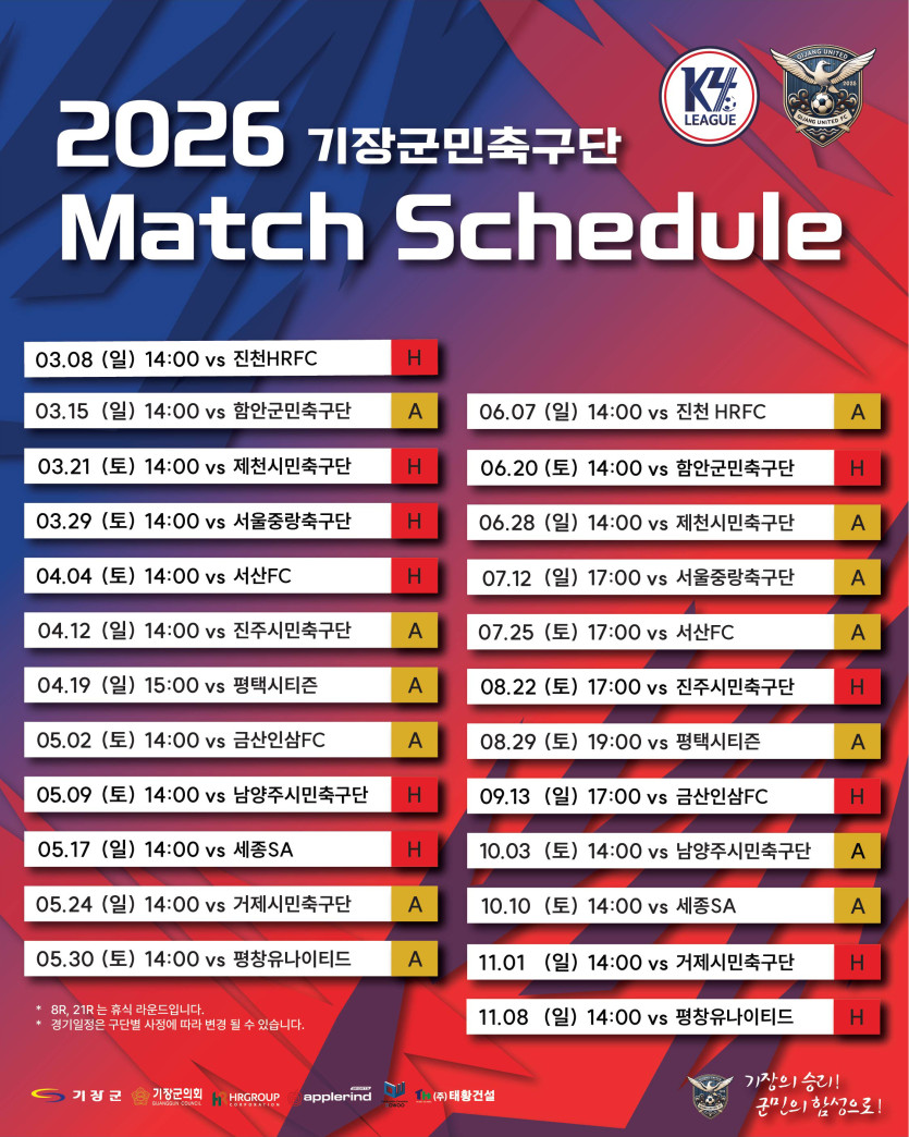 2026 K4리그 기장군민축구단 연간 일정표 페이지 정보 작성자 관리자 조회35회 작성일 26-03-04 16:56 본문 안녕하세요.기장군민축구단 2026 K4리그 연간 일정표입니다.선수들에게 많은 응원과 관심 부탁드립니다.감사합니다. 다음글K4 선수단 2월 훈련일정표 26.02.13 목록